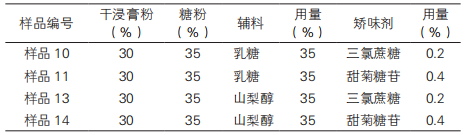 表1 三氯蔗糖與輔料矯味組合味覺信息測(cè)定值的均值 ± 標(biāo)準(zhǔn)差、95% 置信區(qū)間表2甜菊糖苷與輔料矯味組合味覺信息測(cè)定值的均值 ± 標(biāo)準(zhǔn)差、95% 置信區(qū)間表3阿斯巴甜與輔料矯味組合味覺信息測(cè)定值的均值 ± 標(biāo)準(zhǔn)差、95% 置信區(qū)間根據(jù)表1~3,選出甜味、鮮味、鮮味回味較高值的樣品,苦味、苦味回味、澀味、澀味回味較低值的樣品,即選出樣品 10、11、13、14 共 4 個(gè)樣品作為進(jìn)一步研究的對(duì)象,篩選結(jié)果見表4。