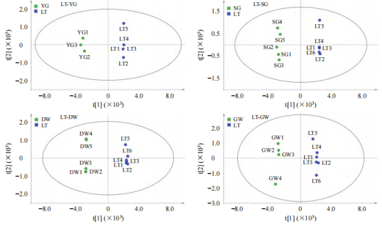 太子參藥材加工方式有直接曬干和略燙后曬干,本實驗利用頂空固相微萃取-氣相色譜-質譜(HS-SPME-GC-MS)對包括略燙后曬干品在內的太子參不同加工品的揮發(fā)性成分進行鑒定和比較,采用正交偏最小二乘-判別分析(OPLS-DA)篩選出略燙后曬干品與其他加工品之間氣味差異的主要成分。另外,憑借Heracles NEO超快速氣相電子鼻結合數(shù)理統(tǒng)計方法,建立基于氣味特征的快速識別模型對略燙后曬干品進行鑒別。