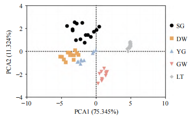 繪制聚類熱圖以呈現(xiàn)不同加工品揮發(fā)性成分整體特征的異同(圖3)。熱圖顯示,5類太子參加工品中,略燙后曬干品LT1~LT6單獨聚為一類,高溫烘干品GW1~GW4單獨聚為一類,低溫烘干品DW1~DW5單獨聚為一類,陰干品YG1~YG3、直接曬干品SG3聚為一類,直接曬干品SG1、SG3~SG5聚為一類,結果說明略燙后曬干品、高溫烘干品、低溫烘干品之間的揮發(fā)性成分差異較大,而直接曬干品與陰干品較為相似。