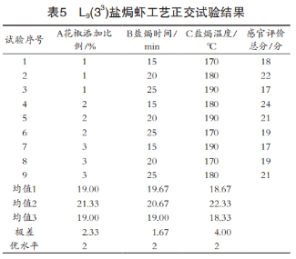 由表2極差值分析可知,各因素對感官評價(jià)的影響由強(qiáng)到弱依次為鹽焗溫度>花椒添加比例>鹽焗時間,即鹽焗溫度對感官評價(jià)分?jǐn)?shù)影響最大。最終確定的鹽焗蝦的優(yōu)化工藝為A2B2C2,即花椒添加比例2%、鹽焗時間20 min和鹽焗溫度180 ℃。按此最優(yōu)工藝進(jìn)行3次驗(yàn)證,所得鹽焗蝦的感官評分平均分為24.8分。
