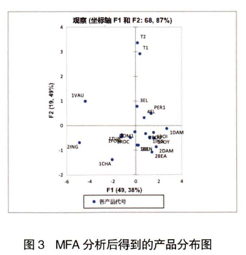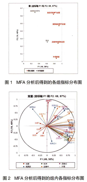 He等在報道中對腐乳進(jìn)行了多維度分析,包括由兩種感官分析方法獲得的感官數(shù)據(jù)(0DA和FP)、GC-MS靶標(biāo)揮發(fā)性化合物分析及物理性質(zhì)分析,MFA 在該文中被用于解釋這3類指標(biāo)之間的關(guān)系及物理化學(xué)指標(biāo)對感官的貢獻(xiàn)。陸龍建等運(yùn)用 MFA法對分類化學(xué)成分與感官評價結(jié)果進(jìn)行了綜合分析,并比較了采用化學(xué)成分和感官評價兩種方法剖析卷煙風(fēng)格特征時的一致性。
