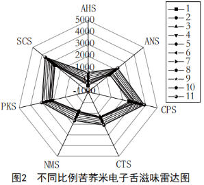 通過味覺分析比較發(fā)現(xiàn)不同比例苦蕎米飯的滋味呈現(xiàn)一定的規(guī)律性,隨著苦蕎米添加量的增大,各傳感器的響應(yīng)值也隨之增大。上述結(jié)果表明,不同比例的苦蕎米飯滋味會(huì)因苦蕎米添加量的不同而逐漸變化。這一結(jié)果表明,不同比例的苦蕎米飯滋味會(huì)因苦蕎米添加量的不同而逐漸變化。