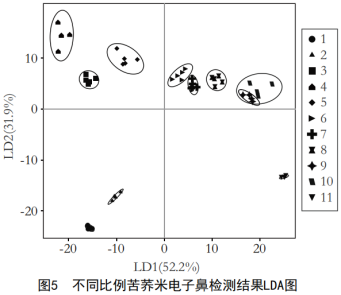 經(jīng)電子鼻測定的線性判別分析如圖2所示。由圖可知,LD1的貢獻(xiàn)率為52.2%,LD2的貢獻(xiàn)率為31.9%,其累計(jì)貢獻(xiàn)率為84.1%,能夠反映樣品中的大部分氣味信息。1、2、11號(hào)樣本與其余樣本距離較遠(yuǎn),表明了1、2、11號(hào)樣本與其余樣本之間的差異較大。6~10號(hào)樣本距離較近,存在部分重疊現(xiàn)象,說明這幾組樣本氣味相似,并且隨著苦蕎米添加量的增大,樣本呈現(xiàn)出從左向右依次移動(dòng)的趨勢。1、2號(hào)樣本米飯的香味較重、苦蕎的香味較淡,苦蕎香味從3號(hào)樣本開始逐漸明顯,11號(hào)樣本苦蕎味過重。