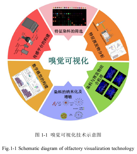 嗅覺(jué)可視化技術(shù)本質(zhì)上是一種新型的電子鼻技術(shù),于2000年由美國(guó)伊利諾伊州立大學(xué)的NealA.Rakow教授和KennethS.Suslick教授首次提出。這項(xiàng)技術(shù)主要依賴(lài)于各種化學(xué)染料組成的可視化傳感器陣列對(duì)樣品中揮發(fā)性氣體的化學(xué)響應(yīng)。這些化學(xué)染料通過(guò)分子間的相互作用(π-π鍵和金屬鍵的作用、酸堿相互作用以及電荷轉(zhuǎn)移等)來(lái)與氣體中的小分子結(jié)合,并且必須具備兩個(gè)條件:(1)染料中必須存在一個(gè)與氣體中小分子強(qiáng)相互作用的中心;(2)染料在接觸小分子氣體時(shí)會(huì)發(fā)生顏色變化。