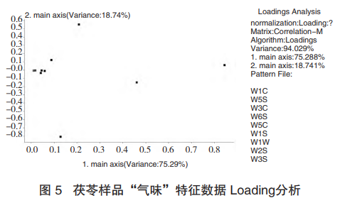 Loadings分析的算法與PCA的算法相同,是對傳感器的分析,得出傳感器區(qū)分樣品的能力。由圖分析可推測,各產(chǎn)地的茯苓樣品在氣味上的差異主要來自于無機硫化物、有機硫化物、甲基類化合物和氮氧化合物。
