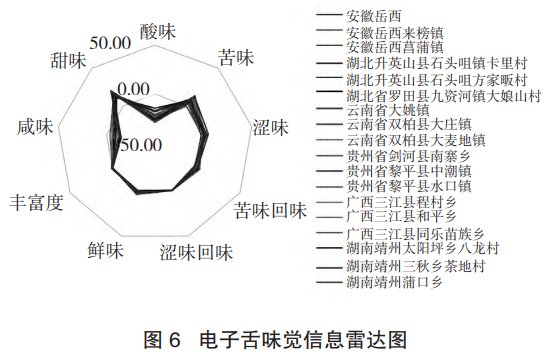 不同于以往人們對茯苓滋味的認識,茯苓樣品除咸味、酸味外,其他的味覺屬性基本都在無味點以上,說明茯苓具有豐富的味覺信息。茯苓最突出的味道是甜味和苦味。另外,不同產(chǎn)地茯苓的某些味覺屬性在雷達圖上重疊度較低,如酸味、澀味和苦味的回味,但各個產(chǎn)地的樣品酸味響應值在無味點-13以下,見圖6。