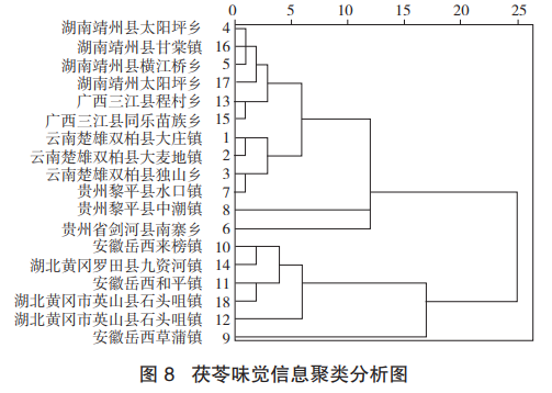 圖7為電子舌檢測結果的響應值降維后所得的主成分分析結果??傮w來看,西南地區(qū)(云南、廣西、貴州)的茯苓樣品與岳西地區(qū)(安徽、湖北)的茯苓樣品能夠得到大致劃分。