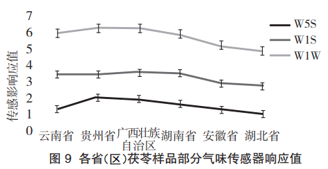 從茯苓氣味的PCA分析結果可知,在地理位置上以長江為分界點,能有效區(qū)分長江以北和長江以南的茯苓樣品。云南、貴州、廣西、湖南的樣品生長和采收于長江以南,湖北和安徽的樣品生長和采收于長江以北。根據(jù)雷達圖可知,W5S、W1S和W1W傳感器響應值較高,Loadings分析結果顯示茯苓氣味的差異主要來源于無機硫化物、有機硫化物、甲基類化合物和氮氧化合物。因此選擇對上述氣味靈敏的傳感器進一步分析茯苓氣味的產(chǎn)地差異,結果如圖9所示,安徽和湖北的茯苓樣品氣味響應值顯然低于云南、貴州、廣西、湖南的樣品,說明長江以北和長江以南的樣品在無機硫化物、有機硫化物、甲基類化合物和氮氧化合物氣味成分上存在較大差異。