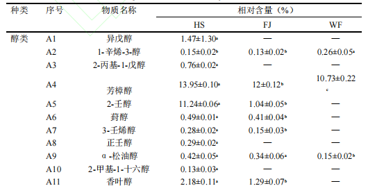 醇類在FJ、HS以及WF樣品中相對含量分別為26.36%、60.25%、13.32%。其中1-辛烯-3-醇、芳樟醇、α-松油醇為三組樣品共有物質,芳樟醇是三組樣品中相對含量最高的揮發(fā)性化合物,分別為FJ組(12%)、HS組(13.95%)、WF組(10.73%)。醛類物質在FJ、HS以及WF樣品中相對含量為2.16%、1.43%、21.09%。并且WF組中醇類物質相對顯著高于(P<0.05)其它兩組樣品。苯甲醛、正辛醛、苯乙醛、壬醛作為三組樣品共有物質。酸類物質樣品FJ(1.21%)、HS(0.63%)和WF(1.53%)中相對含量并不太高,且在WF中相對含量顯著高于(P<0.05)其他兩組。酯類物質主要在WF組樣品中檢出,相對含量為57.39%,顯著高于(P<0.05)FJ組(7.72%)與HS(1.45%)組。酮類物質在FJ和HS樣品中相對含量分別為60.24%和21.72%,而WF樣品中則并未檢測到此類物質。其中2-壬酮為FJ于HS樣品中共有且相對含量最高的物質,可以為發(fā)酵后的濃汁貢獻花香與果香。其他揮發(fā)性物質在三組樣品中共檢出8種,其中3,5-二叔丁基苯酚為HS、FJ、WF樣品共有揮發(fā)性化合物。