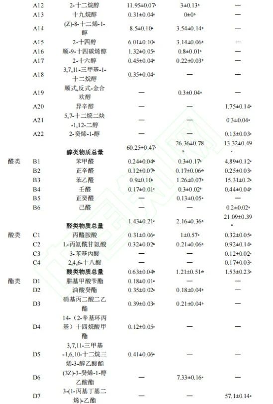 由表1可知3組樣品中共檢測出揮發(fā)性化合物57種,其中醇類22種、醛類6種、酸類4種、酯類8種、酮類9種、其他類8種。