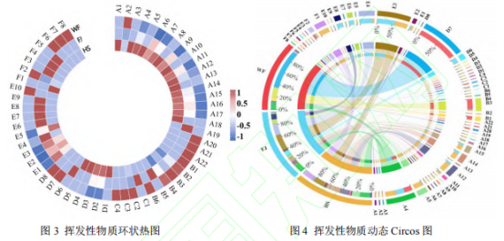 聚類熱圖與動態(tài)Circos圖都可以結合大量數(shù)據(jù),以漸進色帶和對應顏色標簽的占比形式共同將檢測得到的各揮發(fā)性化合物與三組樣品的相關性直觀的展現(xiàn)出來。結合圖3、圖4分析可知,在HS樣品中醇類(A)物質相對含量及種類較多,其中包括芳樟醇(A4)、2-壬醇(A5)和2-十二烷醇(A12)等物質。FJ樣品中酮類(E)物質相對含量與種類相較另外兩組樣品較多,主要包括:2-壬酮(E3)、2-十一酮(E4)等物質。WF樣品中醛類(B)與酸類(C)物質占據(jù)主導,其中芳樟醇(A4)、苯乙醛(B3)等物質為濃汁本身提供了堅果香氣與櫻桃香氣,并且酸類在其發(fā)酵過程中為其他風味物質的形成提供了前體物質。這一結果與表1及PCA分析一致。