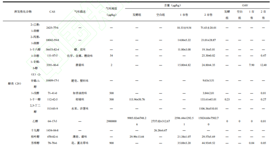 為了更深入了解各組產(chǎn)品電子鼻數(shù)據(jù)集的結(jié)構(gòu),繪制了PCA圖(圖3B)。PC1的貢獻(xiàn)率68.04%,PC2的貢獻(xiàn)率27.68%,兩者總貢獻(xiàn)率95.72%,說明PC1和PC2基本可以代表樣品的整體氣味特征信息。兩組樣品分布距離較遠(yuǎn),可以完全區(qū)分開,表明兩組樣品揮發(fā)性化合物差異明顯,說明乳酸菌發(fā)酵可以明顯改變產(chǎn)品的氣味。