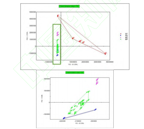 在分析不同種沒(méi)藥氣味差異標(biāo)志物時(shí),比對(duì)放大色譜圖以尋找樣品組間的差異往往繁瑣且復(fù)雜,這種方法雖然直觀,但效率低下、易出錯(cuò)。為了簡(jiǎn)化這一過(guò)程并提高分析的準(zhǔn)確性,本研究采用了一種“先統(tǒng)計(jì)后化學(xué)”的方法。首先,運(yùn)用PCA對(duì)樣品組間的氣味數(shù)據(jù)進(jìn)行深入挖掘。PCA能夠迅速定位到樣品間氣味的主要差異所在,通過(guò)降維處理,將復(fù)雜的數(shù)據(jù)集簡(jiǎn)化為幾個(gè)主要的成分,從而更容易識(shí)別出差異性色譜峰,在對(duì)色譜峰進(jìn)行了篩選時(shí),要選取那些區(qū)分度顯著、峰面積較大且分離效果良好的色譜峰。經(jīng)過(guò)篩選,樣品整體的氣味分布趨勢(shì)與未經(jīng)篩選前保持一致,可以充分證明所選的色譜峰能夠準(zhǔn)確地代表樣品整體的氣味特征。接著,借助AroChembase數(shù)據(jù)庫(kù),對(duì)具有顯著差異的色譜峰進(jìn)行了詳細(xì)的定性分析,識(shí)別這些色譜峰中可能包含的化合物。