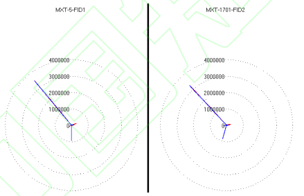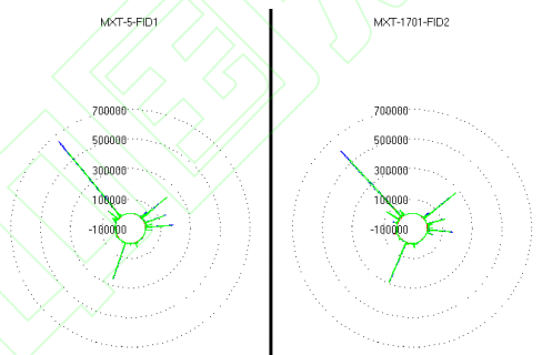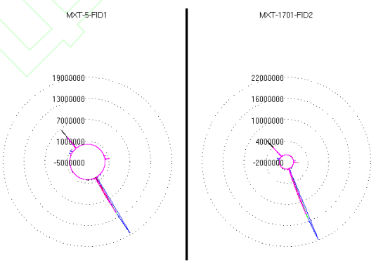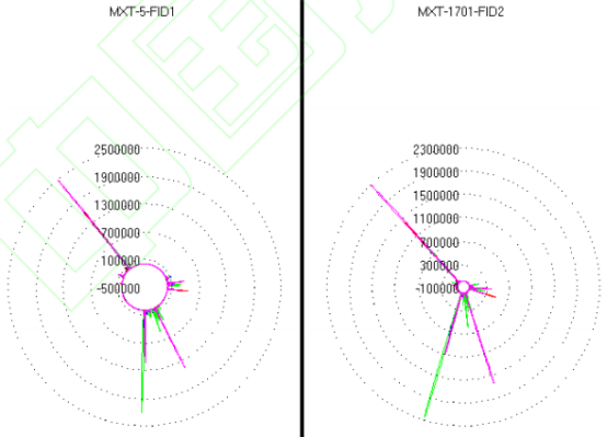 將GC數(shù)據(jù)進(jìn)行同組疊加處理可以更清晰地觀察組內(nèi)共有特征和細(xì)微差異,有助于識(shí)別同組樣本中普遍存在的化合物及其相對(duì)含量。圖2~圖9為各組(組1~組4)沒(méi)藥樣品原始GC疊加圖和雷達(dá)圖疊加圖,GC疊加圖分別展示MXT-5非極性毛細(xì)管柱與MXT-1701中極性毛細(xì)管柱結(jié)果,雷達(dá)圖也可以看出組間和組內(nèi)沒(méi)藥峰面積和保留時(shí)間的差異。組1(JZ1∼JZ4、JZ6)、組2、組3、組4(K1、M5、J1、W1、JZ5)在各自的GC疊加圖和雷達(dá)圖疊加圖中均呈現(xiàn)出相似特征:出峰時(shí)間差異不大、峰面積差異較大。