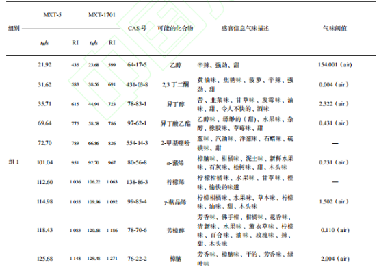 表2 各組沒(méi)藥可能含有的化合物信息及其氣味描述