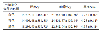 表3   3種色澤氣流膨化青稞米質(zhì)構(gòu)特性測(cè)定結(jié)果