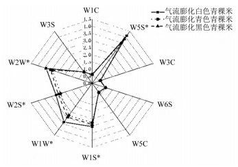 青稞的加工方式多樣,氣流膨化可以使谷物中的水分汽化,谷物組織因劇烈爆破伸展,最終造成組織結(jié)構(gòu)和理化性質(zhì)的改變,在保持食品品質(zhì)方面優(yōu)于傳統(tǒng)膨化方法。本研究采用氣流膨化工藝,以白、青、黑3種色澤青稞膨化米為研究對(duì)象,采用電子鼻、電子舌、電子眼、質(zhì)構(gòu)儀等設(shè)備對(duì)其風(fēng)味特征進(jìn)行比較。