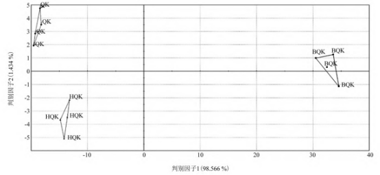 由圖3可知:PC1和PC2對(duì)總方差的貢獻(xiàn)率分別為99.925%和0.07441%,總和接近100%,說明電子舌能夠區(qū)分三種氣流膨化青稞米的滋味變化信息,且3者之間的滋味存在差異。由圖4可知:第1區(qū)分指數(shù)為98.566%,第2區(qū)分指數(shù)為1.434%,二者合計(jì)為100%,可見判別因子分析3種色澤氣流膨化青稞米滋味差異的效果更好,膨化白色青稞米與膨化青色青稞米、膨化黑色青稞米滋味存在較大差異,膨化青色青稞米與膨化黑色青稞米滋味存在較小差異。