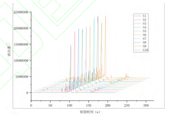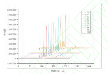 利用電子鼻對10種不同產(chǎn)地草果樣品進行的檢測分析及后續(xù)數(shù)據(jù)處理,獲得了在MXT-5色譜柱和MXT-1701色譜柱上的氣味指紋圖譜,結(jié)果如圖2、圖3所示,觀察到不同產(chǎn)地草果的氣味成分色譜峰在出峰時間和峰面積上均呈現(xiàn)出明顯差異。若通過比對放大色譜圖來尋找樣品組間的差異,此過程較為繁瑣與復雜。為了提高分析效率,故采用先統(tǒng)計后化學分析的方法,首先,通過PCA法對不同產(chǎn)地草果樣品的氣味進行統(tǒng)計分析,識別氣味上的差異。在PCA分析的基礎上,進一步確定差異色譜峰。隨后,利用AroChembase數(shù)據(jù)庫對這些差異色譜峰進行定性分析。