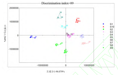 主成分分析(Principal Component Analysis,PCA)是一種常用統(tǒng)計分析方法,它可以將多個變量轉(zhuǎn)換為少數(shù)幾個主成分,從而簡化數(shù)據(jù)分析。本研究使用PCA算法對電子鼻采集的原始數(shù)據(jù)進行分析,通過計算主成分識別指數(shù)(Discrimination Index,DI)和貢獻率來識別變量。通過PCA分析,可以有效地揭示不同產(chǎn)地草果樣品氣味特征的差異。第一主成分(PC1)與第二主成分(PC2)的區(qū)分貢獻率之和為99.58%(圖4),表明這兩個主成分足以解釋10種不同產(chǎn)地草果樣品間的絕大部分的氣味差異,驗證了PCA模型能夠非常好地反映不同產(chǎn)地草果樣品間的氣味差異。識別指數(shù)(DI)是一種量化指標,用于衡量數(shù)據(jù)集或?qū)嶒灲Y(jié)果中不同樣品或樣本之間的區(qū)分度。DI的數(shù)值大小直接關聯(lián)于數(shù)據(jù)集中樣本間的差異性。DI值越大,表示數(shù)據(jù)集中不同樣品或樣本之間的區(qū)分度越高,即模型或?qū)嶒灧椒ǖ膮^(qū)分效果越好。草果樣品在主成分分析圖上的DI值達到89,進一步表明基于氣味特征的差異可以有效地區(qū)分10種不同產(chǎn)地的草果樣品。