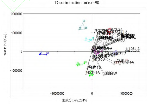 為深化對不同產(chǎn)地草果的區(qū)分,在PCA模型的基礎上,進一步構建DFA模型,以縮小組內(nèi)變異并實現(xiàn)對草果產(chǎn)地的快速有效鑒別。這一分析將有助于精確識別和區(qū)分不同產(chǎn)地的草果,為草果產(chǎn)地溯源鑒別提供科學依據(jù)。判別因子分析(Discriminant Factor Analysis,DFA)法是一種判定個體所屬類別的統(tǒng)計方法,它在主成分分析的基礎上把組內(nèi)距離減小,組間距離增大,從而提高樣本的區(qū)分度。DFA分析在樣本數(shù)據(jù)庫構建完成后,對于未知樣本的定性判別具有重要作用,能夠確定其所屬的類別,適用于產(chǎn)品真?zhèn)舞b定、產(chǎn)地識別以及未知樣本的分類等多種應用場景。