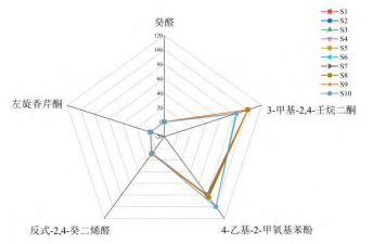 揮發(fā)性化合物對食品氣味的貢獻不僅取決于其含量,還受到嗅覺閾值的影響。含量相同的兩種化合物,同種介質(zhì)中閾值越低則氣味越強。對于含量不同,閾值不同的兩種物質(zhì),則可以計算其ROAV值,從而評估不同化合物對草果氣味的具體貢獻,確定其在形成草果特有氣味中的重要性。基于峰面積歸一化法計算得到相對含量,以及通過AroChembase數(shù)據(jù)庫查詢得到嗅覺閾值。表5為云南西雙版納草果中主要差異揮發(fā)性化合物ROAV與氣味描述分析結(jié)果,ROAV值位于1至100范圍內(nèi)的化合物有三種,分別是4-乙基-2-甲氧基苯酚、3-甲基-2,4-壬烷二酮和反式-2,4-癸二烯醛,這些化合物對草果的氣味特征起到關鍵作用。ROAV值介于0.1至1之間的兩種化合物,癸醛和左旋香芹酮,對草果的氣味特征起到重要的修飾作用。結(jié)合這些化合物的氣味描述,得出草果的主要氣味特征包括辛辣、柑橘、酚醛、刺鼻和脂肪等味道。而關于新鮮草果的氣味描述主要為柑橘、草藥、辛辣、松樹、水果、脂肪等,結(jié)合兩者可知,草果鮮果和草果干果兩者氣味相似均有辛辣味、脂肪味等。