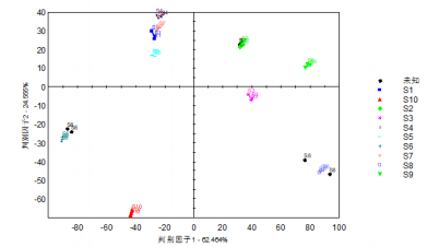 在主成分分析基礎上,對10種不同產(chǎn)地草果樣品進行判別因子分析,分析結(jié)果如圖8顯示,判別因子1判別指數(shù)為62.46%,判別因子2判別指數(shù)為24.56%,不同產(chǎn)地草果樣品組內(nèi)分布集中且離散程度小,組間分布離散程度大,表明該分析方法能夠有效地區(qū)分不同產(chǎn)地的草果樣品。進一步地,將3種不同產(chǎn)地的草果未知樣本的圖譜信息投射到已建立的DFA模型中,每種未知樣本均設置了兩組重復。如圖8所示,通過模型判定,3種未知樣本分別被準確歸類到S2、S6和S8三個不同的產(chǎn)地。具體到每個未知樣本,歸屬于S2產(chǎn)地的樣本識別準確率分別為98.9%和99.2%,歸屬于S6產(chǎn)地的樣本識別準確率分別為95.5%和94.2%,而歸屬于S8產(chǎn)地的樣本識別準確率分別為81.7%和97.2%。這些結(jié)果表明,DFA模型對于未知草果樣品的判別具有較高的準確性。因此,基于DFA模型的分析,可以快速而準確地鑒定草果的產(chǎn)地,為草果的產(chǎn)地溯源提供了一種有效的技術手段。