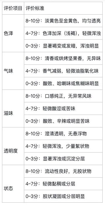 感官評價標(biāo)準(zhǔn)依據(jù)GB 2716-2018《食品安全國家標(biāo)準(zhǔn) 植物油》制定(表1)。實驗前對評價小組成員進行系統(tǒng)培訓(xùn),通過理論講解與樣品比對,確保其精準(zhǔn)掌握核桃油在不同氧化階段的色澤、氣味及滋味特征。樣品評價流程:取20 mL油樣于透明玻璃燒杯中,在自然光線下記錄其色澤與透明度;隨后將樣品置于50 ℃恒溫水浴中加熱10 min,玻璃棒勻速攪拌后,立即嗅聞?chuàng)]發(fā)性氣味特征。滋味評價前,評價員需以溫開水漱口,取5 mL油樣于口腔內(nèi)緩慢含漱,重點感知酸敗、哈喇味等異常風(fēng)味。每份樣品由 12 名小組成員獨立評價,結(jié)果(十分制)以去掉最高分和最低分后取平均值為準(zhǔn),結(jié)果保留兩位小數(shù)。