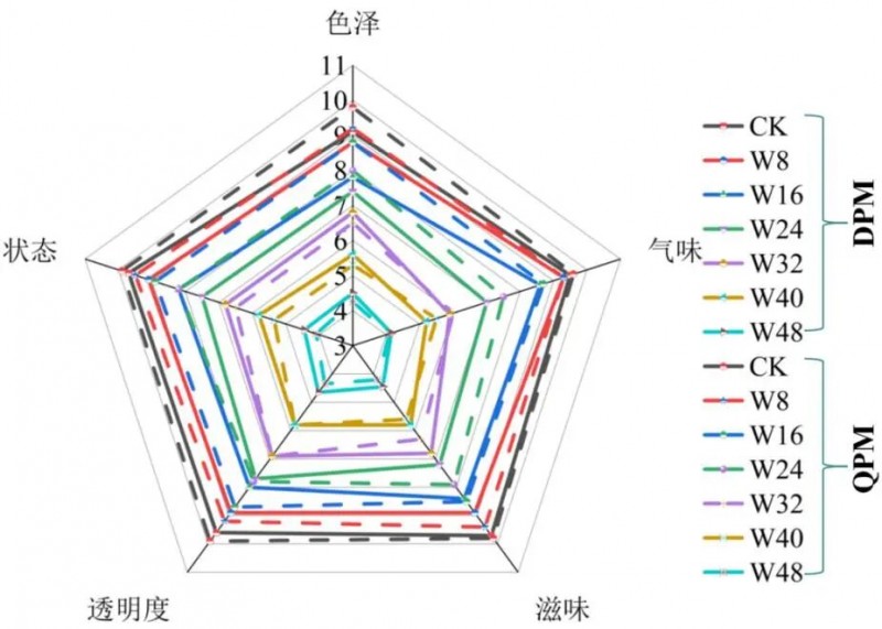 圖1為兩種核桃油隨貯藏時間延長得到的感官評分雷達(dá)圖,DPM和QPM核桃油感官品質(zhì)在貯藏0周感官評分相近且處于較高水平,分別為9.50分和9.80分,表明初始品質(zhì)良好。隨著貯藏時間延長,兩者感官評分均呈下降趨勢,其中QPM從第8周開始呈現(xiàn)顯著的下降趨墊,而DPM則從第16周開始呈現(xiàn)顯著下降趨勢(P<0.05),目整個貯藏過程中,QPM的下降幅度總體大于DPM。推測可能是慶為去仁衣核桃油更易發(fā)生氧化、水解等反應(yīng),產(chǎn)生如醛、酮、游離脂肪酸等異味物質(zhì),從而導(dǎo)致風(fēng)味、色澤和氣味等感官品質(zhì)的快速劣化;相比之下,DPM的感官評分下降相對緩慢,這很可能得益于核桃仁衣中含有多種抗氧化成分的保護作用,它們可以有效清除自由基,減緩氧化反應(yīng)的進行,進而延緩感官品質(zhì)的下降。然而,QPM的色澤在初期明顯優(yōu)于DPM,這可能與核桃仁衣中的色素在壓榨過程中溶出有關(guān),使得DPM顏色較QPM略深且透明度較差。