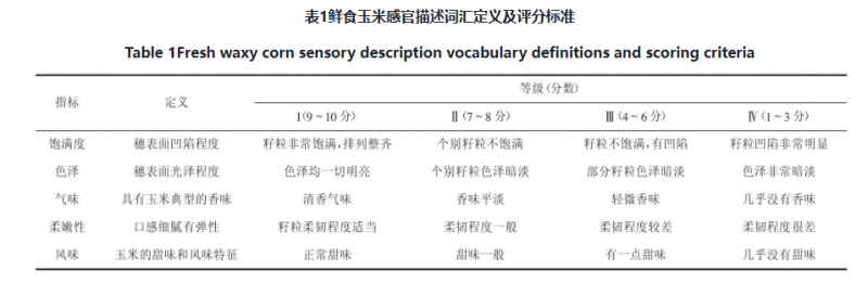 剝?nèi)ヵr食玉米樣品的包裝,清洗干凈,放入沸水中煮20 min,取出放于案板上,瀝干水分,切成3~4 cm小段。由30人組成的感官評定小組對玉米樣品進行評分,每次品嘗前用清水漱口。評價標準見表1。