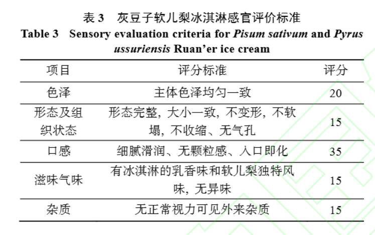 參照 GB/T 31114—2014《冷凍飲品 冰淇淋》, 制定灰豆子軟兒梨冰淇淋感官品質(zhì)評定標準。分別對不同配比的灰豆子軟兒梨冰淇淋色澤、形態(tài)、組織、滋味氣味、雜質(zhì)進行評價。感官評價人員 10 人, 男女各占二分之一, 其中 25~35 歲 3 人, 36~45 歲 4 人; 45 歲以上 3 人, 參與感官評價人員均為具有食品研發(fā)工作經(jīng)驗且接受過基礎(chǔ)感官評價培訓。評價過程各樣品順序隨機, 感官評價采用百分制,色澤、形態(tài)及組織狀態(tài)、口感、滋味氣味、雜質(zhì) 5 項指標分別設(shè)定最高分數(shù), 見表3。